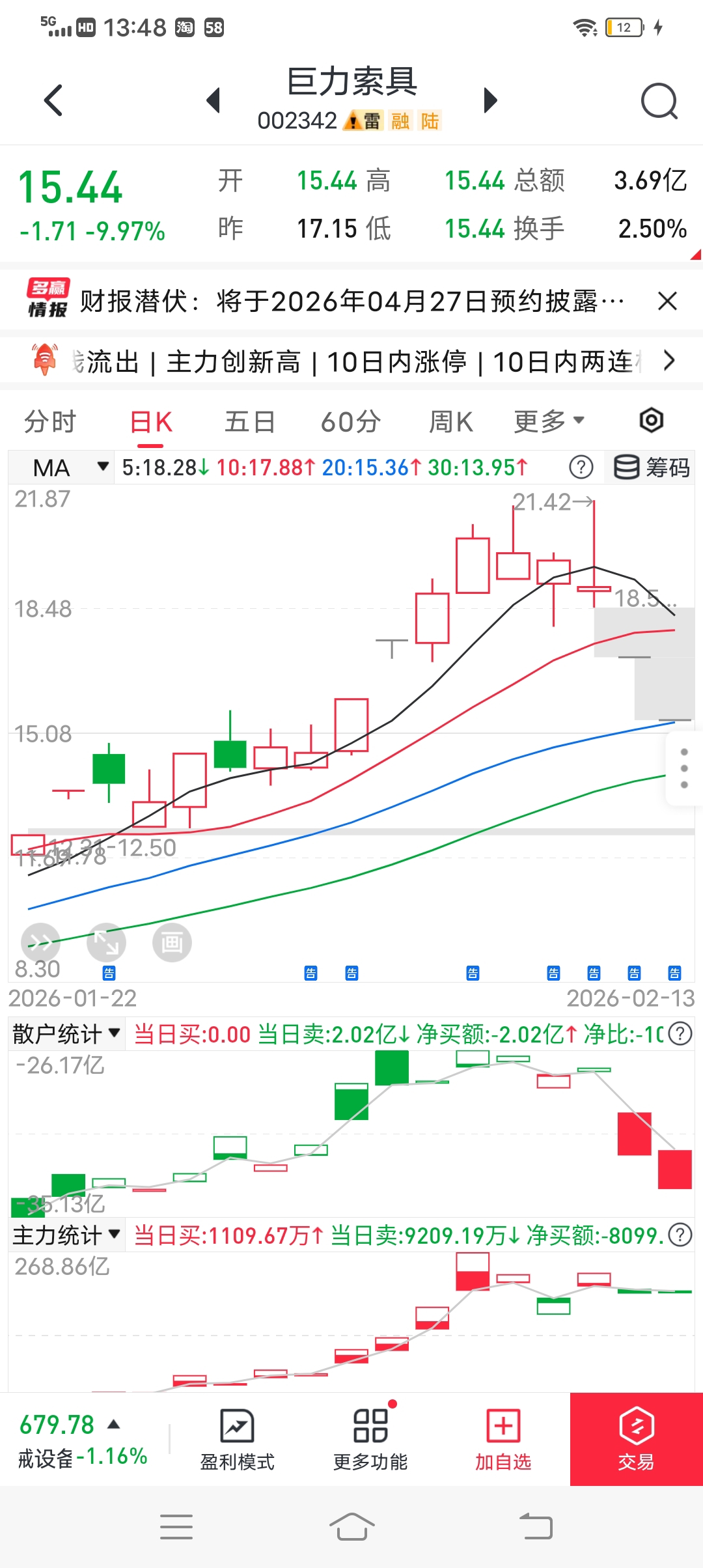 $巨力索具(SZ002342)$ 经传多赢手机版数据123元年费,控盘量化机构对接的对象,被对接散户