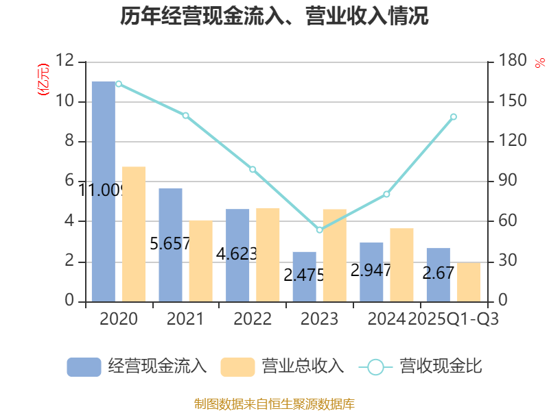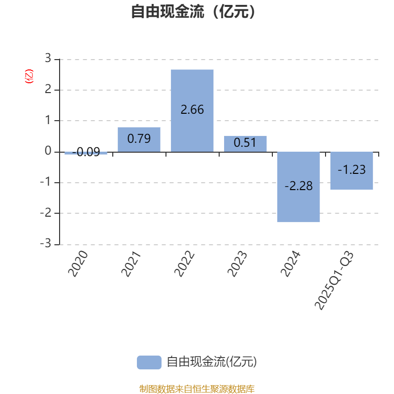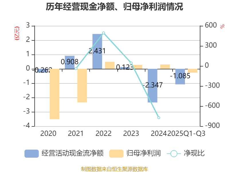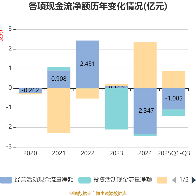 2025年前三季度,公司经营活动现金流净额为-1.09亿元,同比增加4231.22万元;筹资活动现金流净额8678.59万元,同比减少3538.81万元;投资活动现金流净额-3441.8万元,上年同期为-1562.54万元。