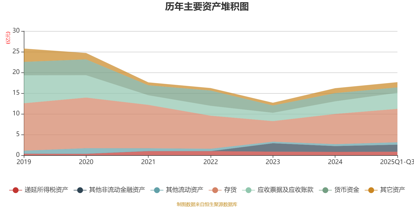 资产重大变化方面,截至2025年三季度末,公司货币资金较上年末减少33.44%,占公司总资产比重下降4.77个百分点;应收票据及应收账款较上年末增加26.8%,占公司总资产比重上升3.08个百分点;其他非流动金融资产较上年末增加21.51%,占公司总资产比重上升0.99个百分点;存货较上年末增加10.69%,占公司总资产比重上升0.69个百分点。