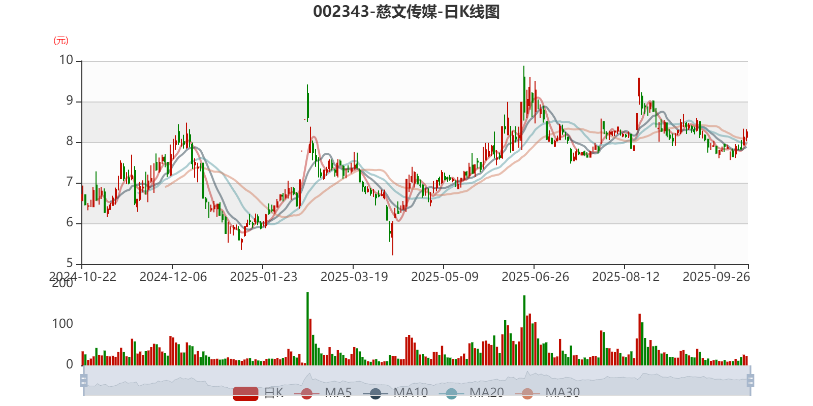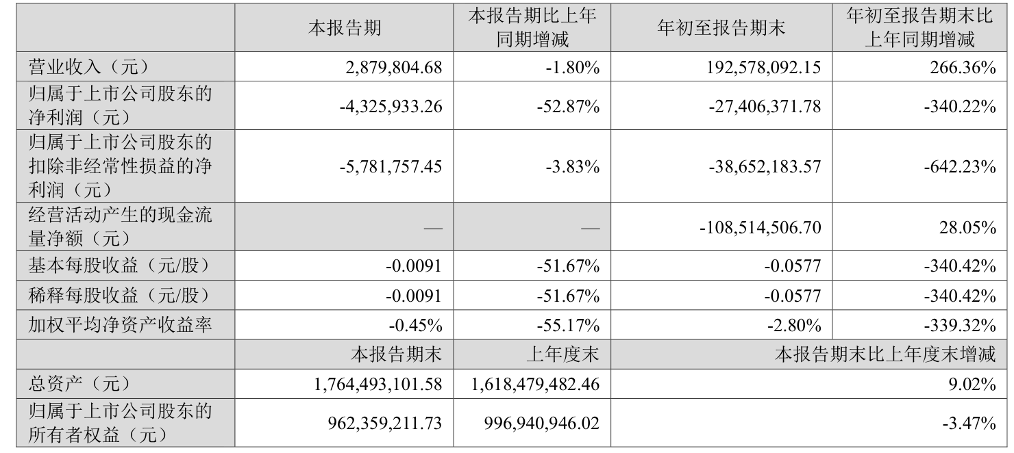 中证智能财讯慈文传媒(002343)10月22日披露2025年第三季度报告。前三季度公司实现营业总收入1.93亿元,同比增长266.36%;归母净利润亏损2740.64万元,上年同期盈利1140.89万元;扣非净利润亏损3865.22万元,上年同期盈利712.84万元;经营活动产生的现金流量净额为-1.09亿元,上年同期为-1.51亿元;报告期内,慈文传媒基本每股收益为-0.0577元,加权平均净资产收益率为-2.80%。