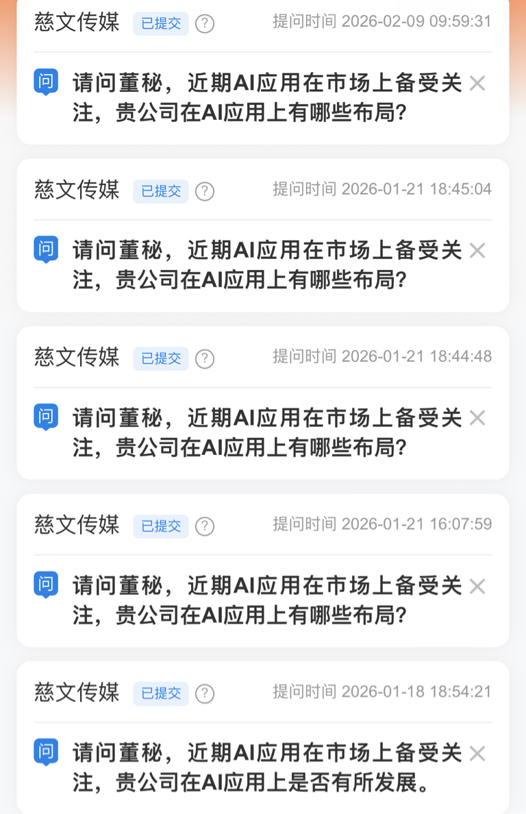 $慈文传媒(SZ002343)$ 为什么不涨自己看,第一种可能,公司没有AI应用,第二种可能,董秘自己就不想让股价涨起来。所以慈文是杂毛