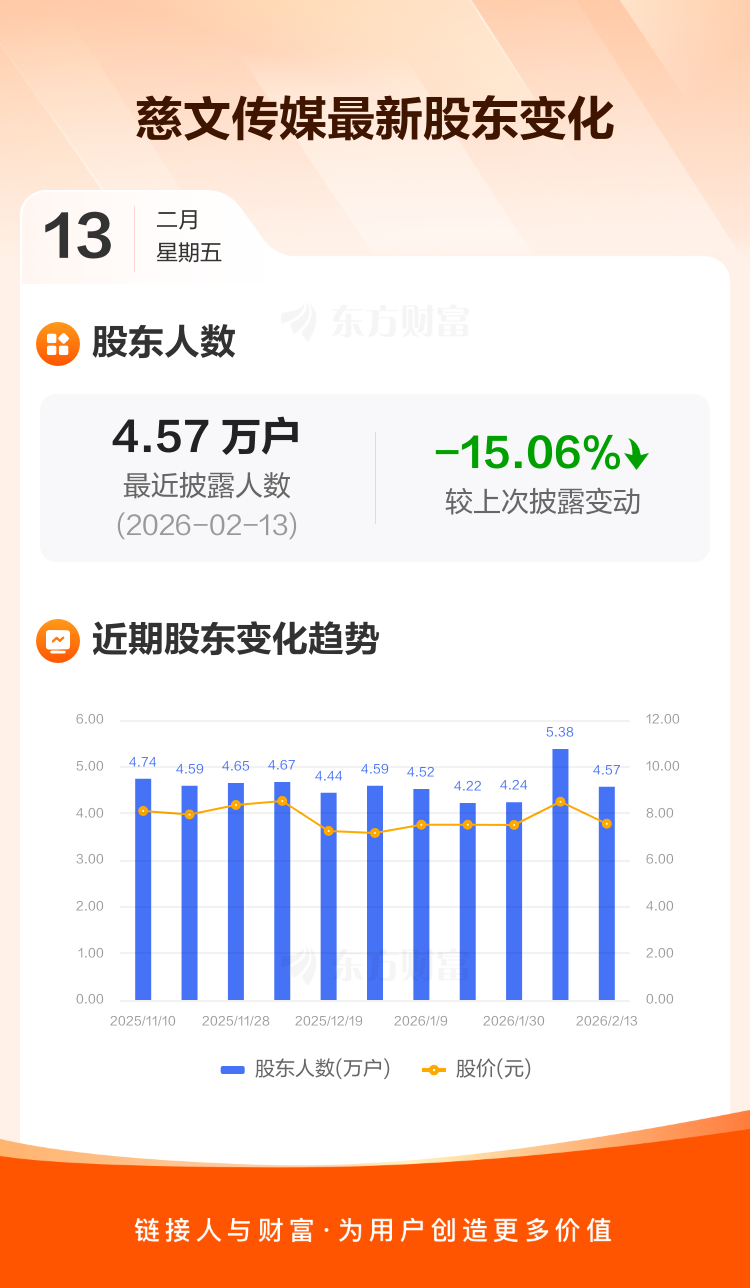 慈文传媒最新披露数据显示,截至2月13日公司股东户数为4.57万户,较上期(2026年2月10日)减少8104户,降幅为15.06%。户均持有流通股数量由上期的8803股上升至1.04万股,户均持股金额由上期的7.48万元增加至7.83万元。