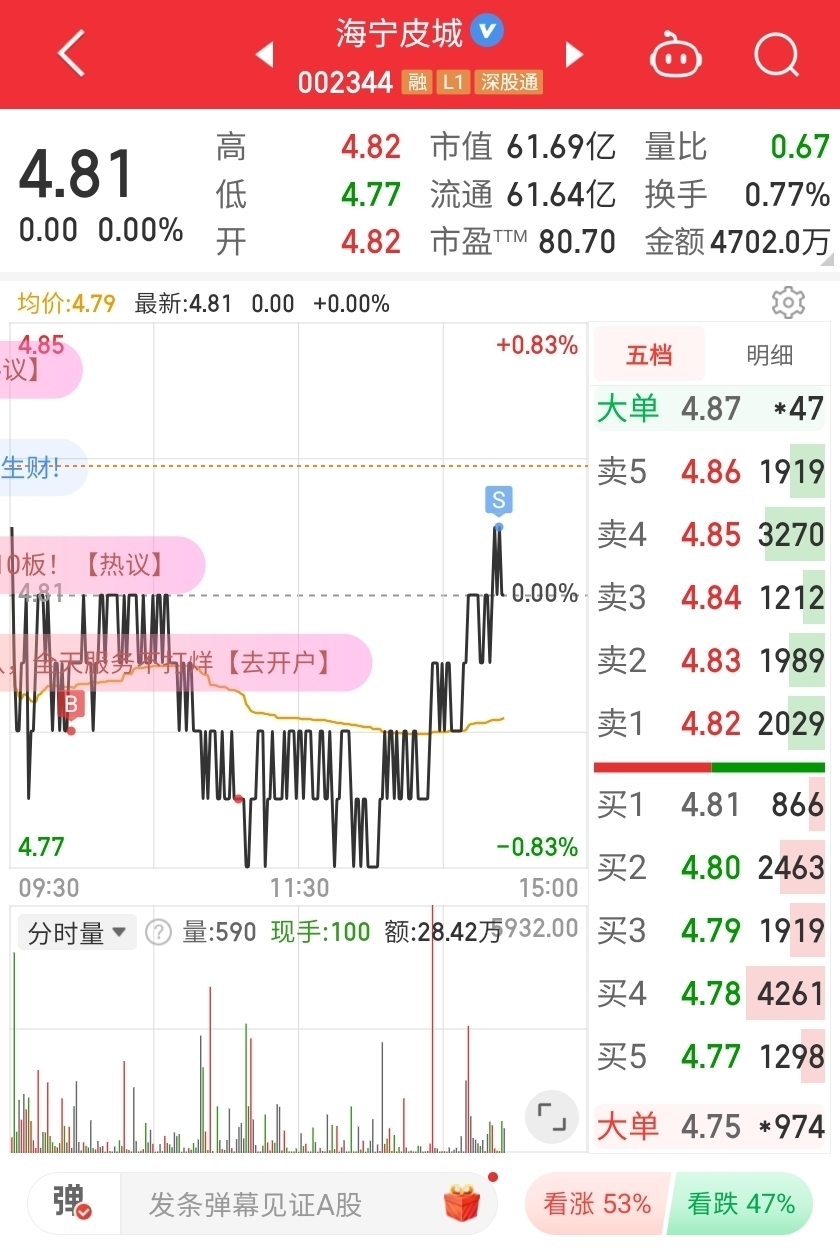 $海宁皮城(SZ002344)$ 3分差价!
