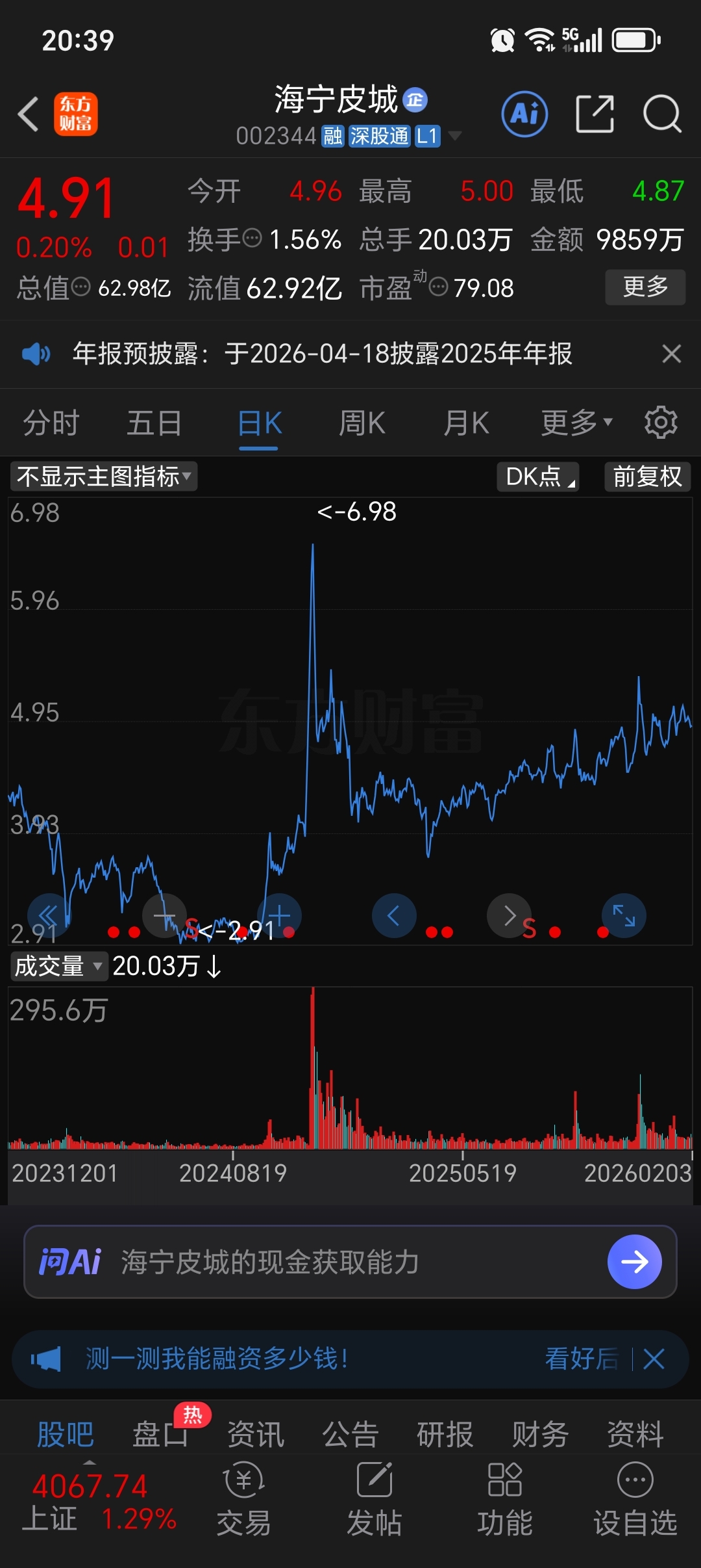 $海宁皮城(SZ002344)$ 这还看不懂?结合下方量能看哈,第一张长期趋势图,主力需要解套,量能都没放出来,出毛货啊?第二张图,结合下方量能看哈,周线图,典型洗盘表现,此处还唱空要么就是不懂,要么就是想骗筹码,无惧大盘变化,重仓持有,下来只买不卖
