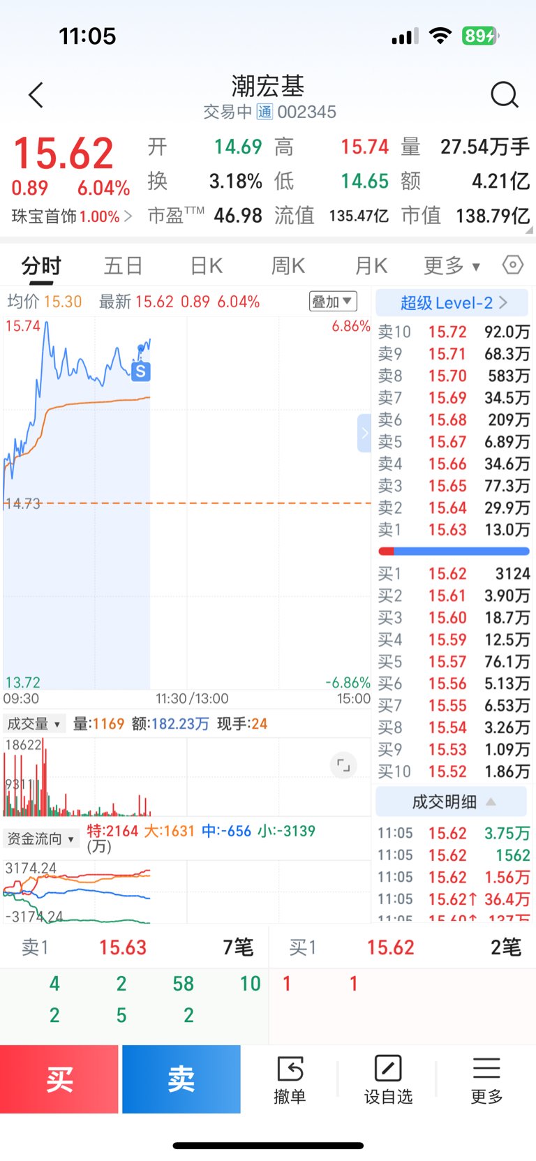 $潮宏基(SZ002345)$ 家人们,我卖飞了