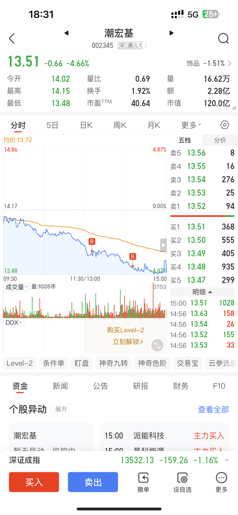 $潮宏基(SZ002345)$ 昨天买了一手,今天买了三手,打个底仓,明天开始,按1 3 5 10 万加仓标准执行