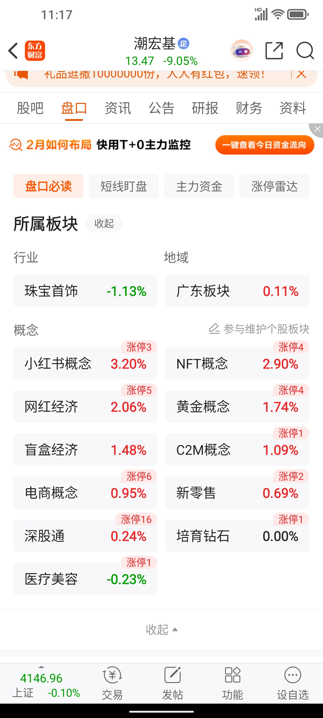 潮宏基总是能精准的在一片红的板块中找到那个绿的然后猛猛的跌下去
