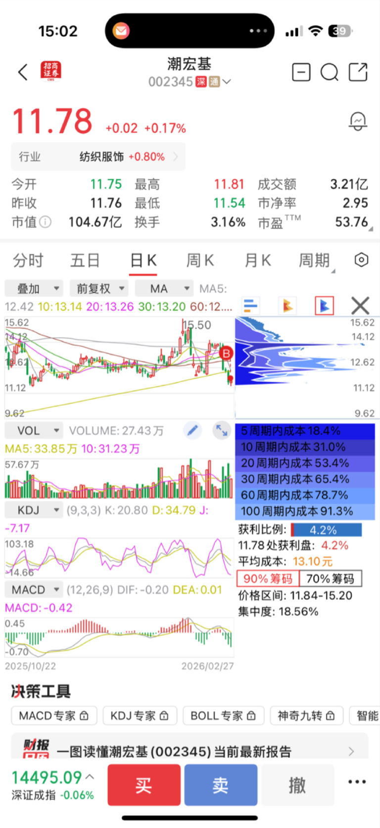 $潮宏基(SZ002345)$ 博弈一下,几天量能放大散户看到所有均线破位该割的也割了,也拿到筹码了