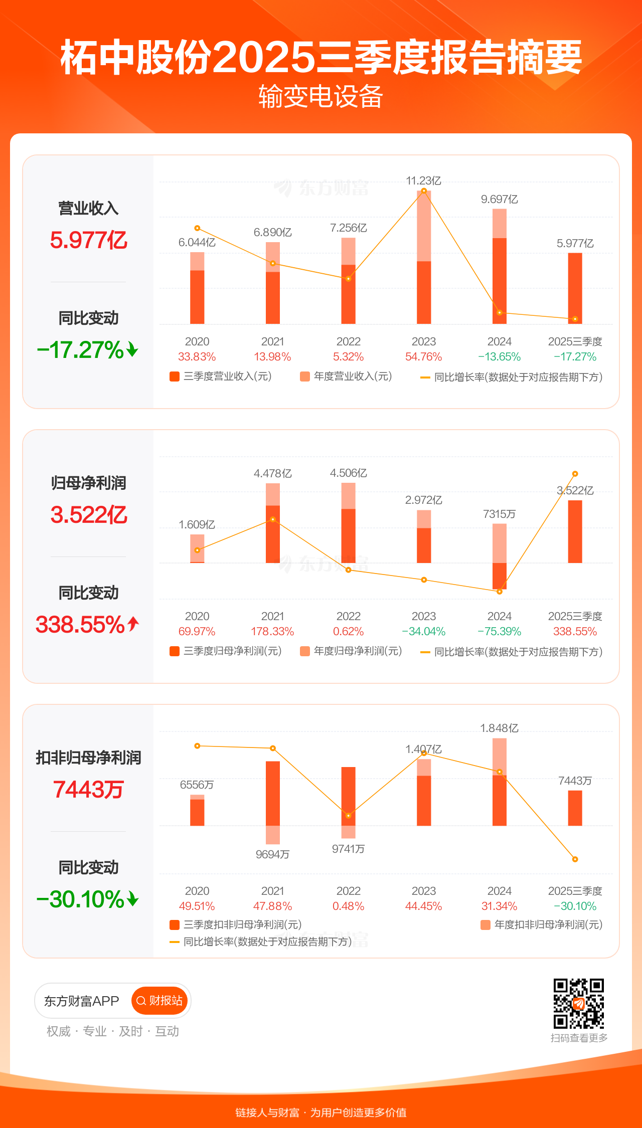 柘中股份10月31日发布2025年三季报显示,公司前三季实现营业收入5.98亿元,同比下滑17.27%;归母净利润3.52亿元,同比增长338.55%;扣非归母净利润7443.22万元,同比下滑30.10%。