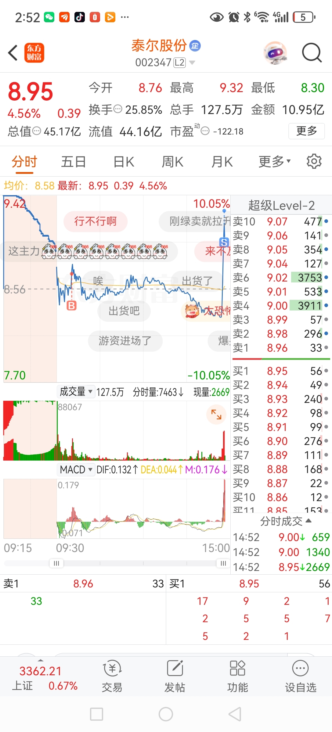 $泰尔股份(SZ002347)$ 9.28精准逃顶