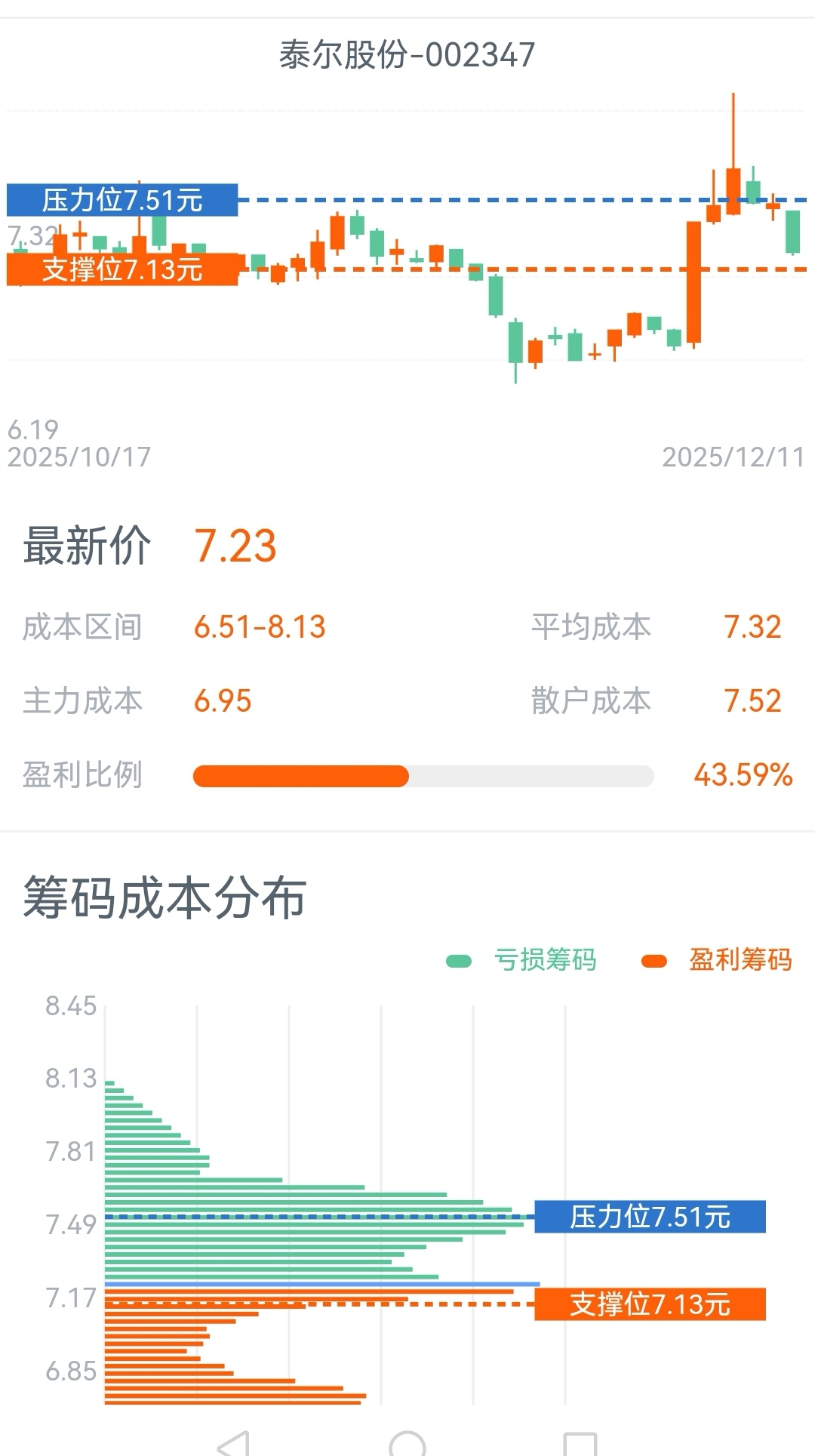 复盘泰尔;技术形态;横盘震荡支撑压力;6.51----8.13主力成本;7.05