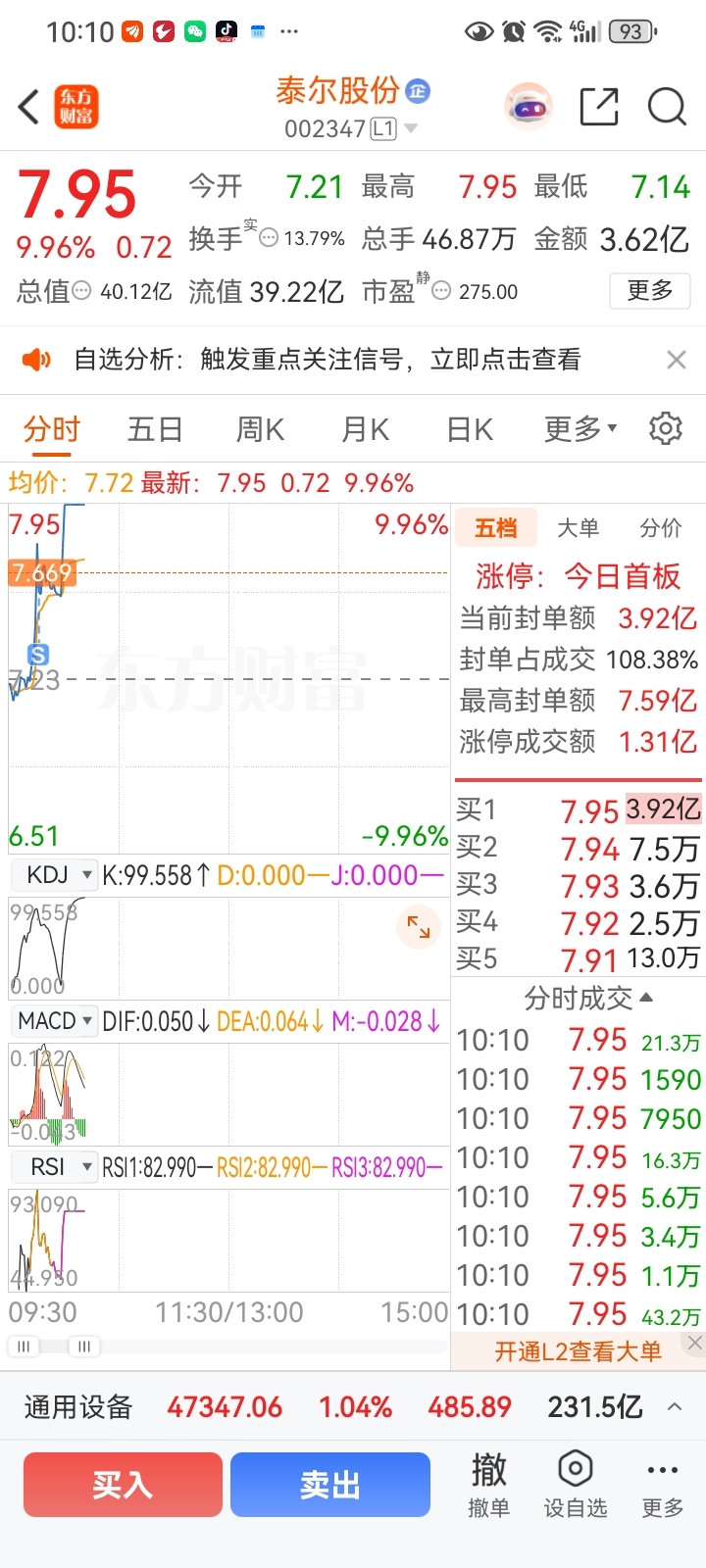 $泰尔股份(SZ002347)$ 卖早了,上涨泛力时卖出半仓。出来的钱买入了巨轮#炒股日记#