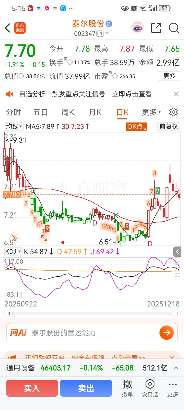 $泰尔股份(SZ002347)$ 12月5号进来,已经三进两出,,持仓成本7.78
