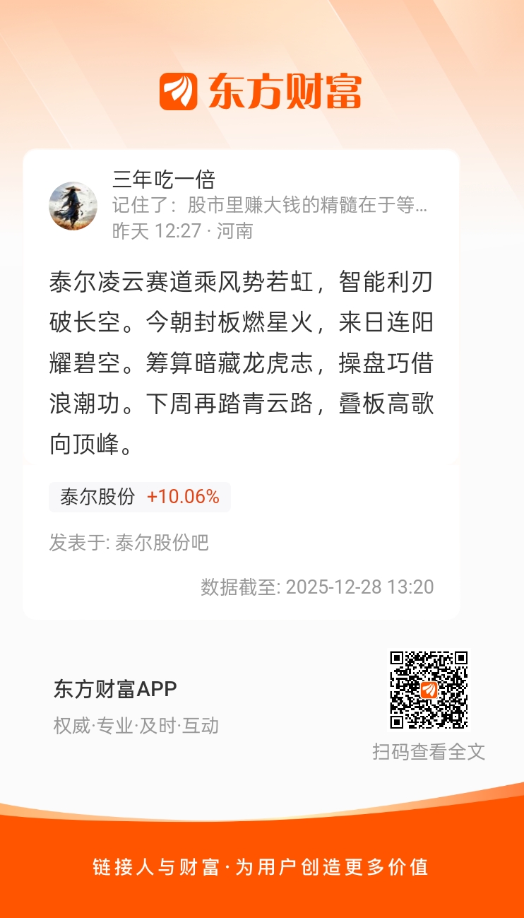 泰尔凌云赛道乘风势若虹,智能利刃破长空。今朝封板燃星火,来日连阳耀碧空。筹算暗藏龙虎志,操盘巧借浪潮功。下周再踏青云路,叠板高歌向顶峰。
