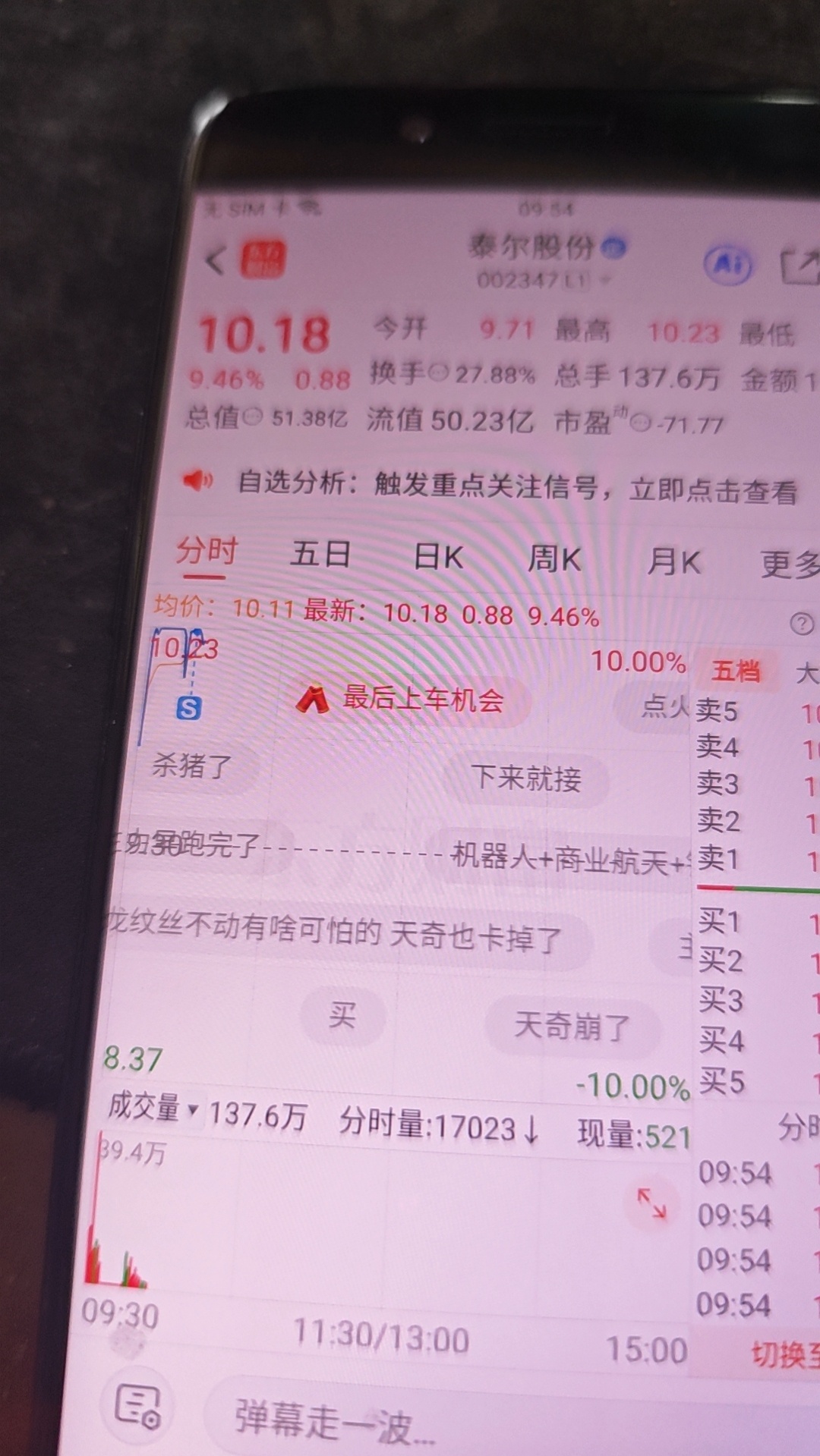 $泰尔股份(SZ002347)$ 昨天卖了泰尔转手买的雷科。没仓位了。要不