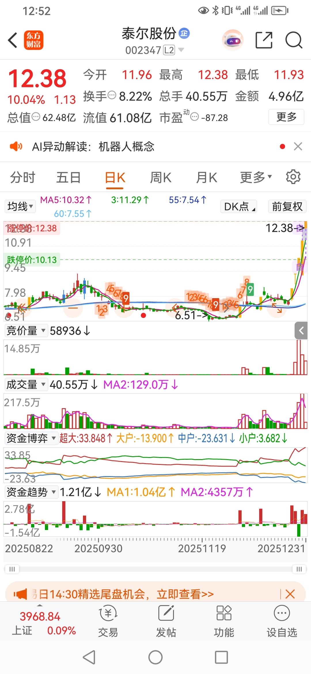@妙想@安庆涨停王姐@追求今天日进斗金军哥,泰尔股份。