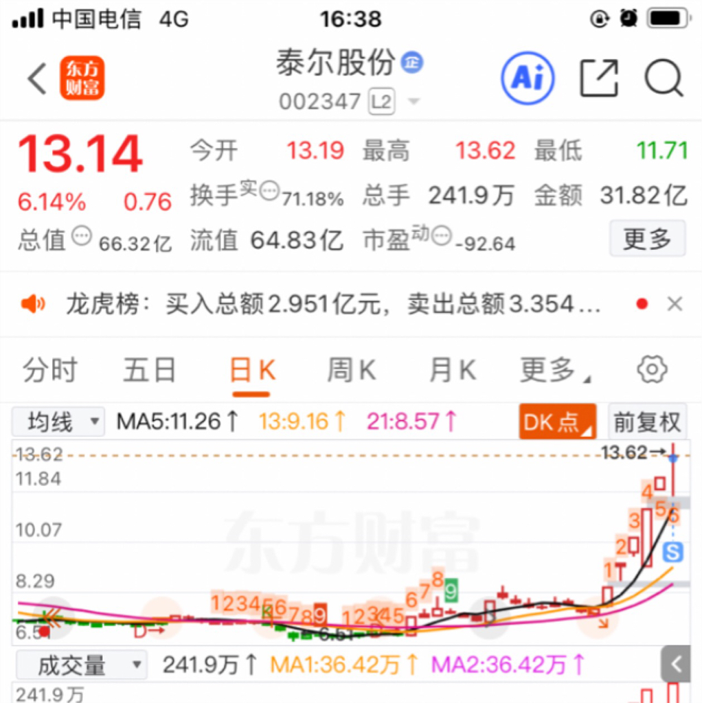 $泰尔股份(SZ002347)$ 又是洗我的一天,其实均价线上可以多等一会的,就可以涨停价走了,算了,不冒险了,走了,感谢!