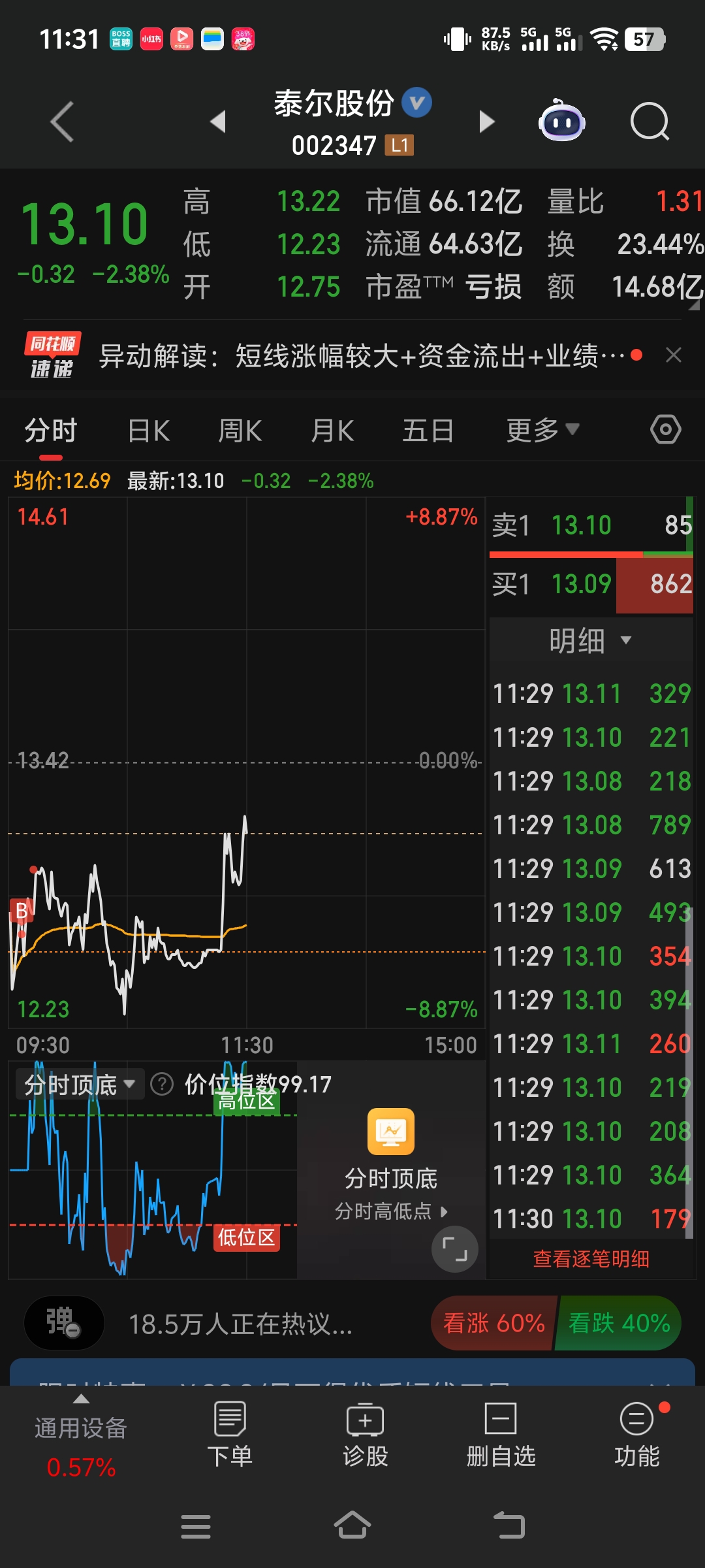 $泰尔股份(SZ002347)$ 下午依旧会红盘,现在买的后悔,水下是买点,前期获利盘已经走了,接力走趋势