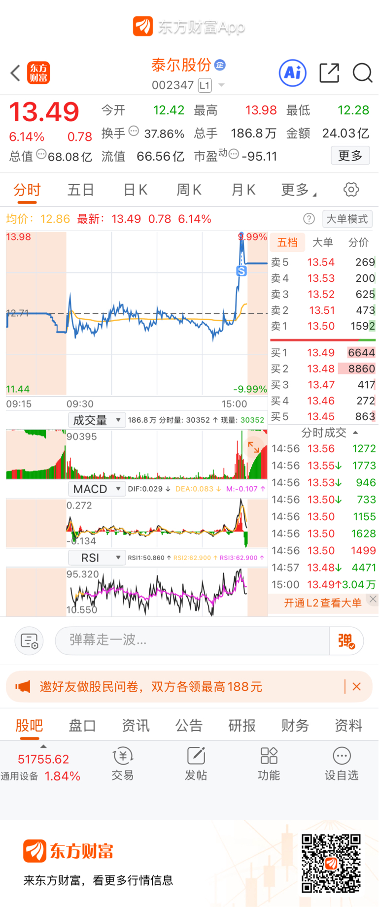 $泰尔股份(SZ002347)$ 谢谢主力,跑了一半再说,忍了一天差点割肉