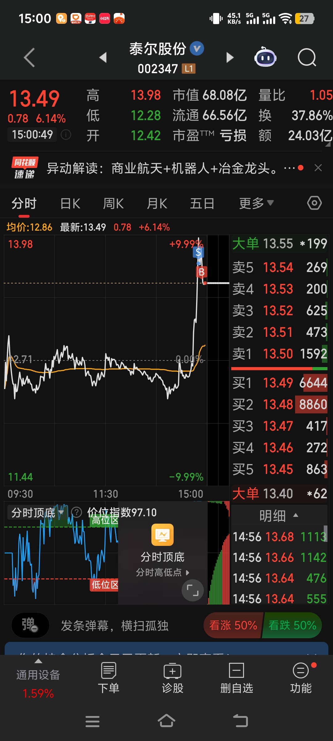 $泰尔股份(SZ002347)$ 恭喜早盘介入的股友,今天平盘出的应该都是获利盘,今天反包,后续走趋势看好。
