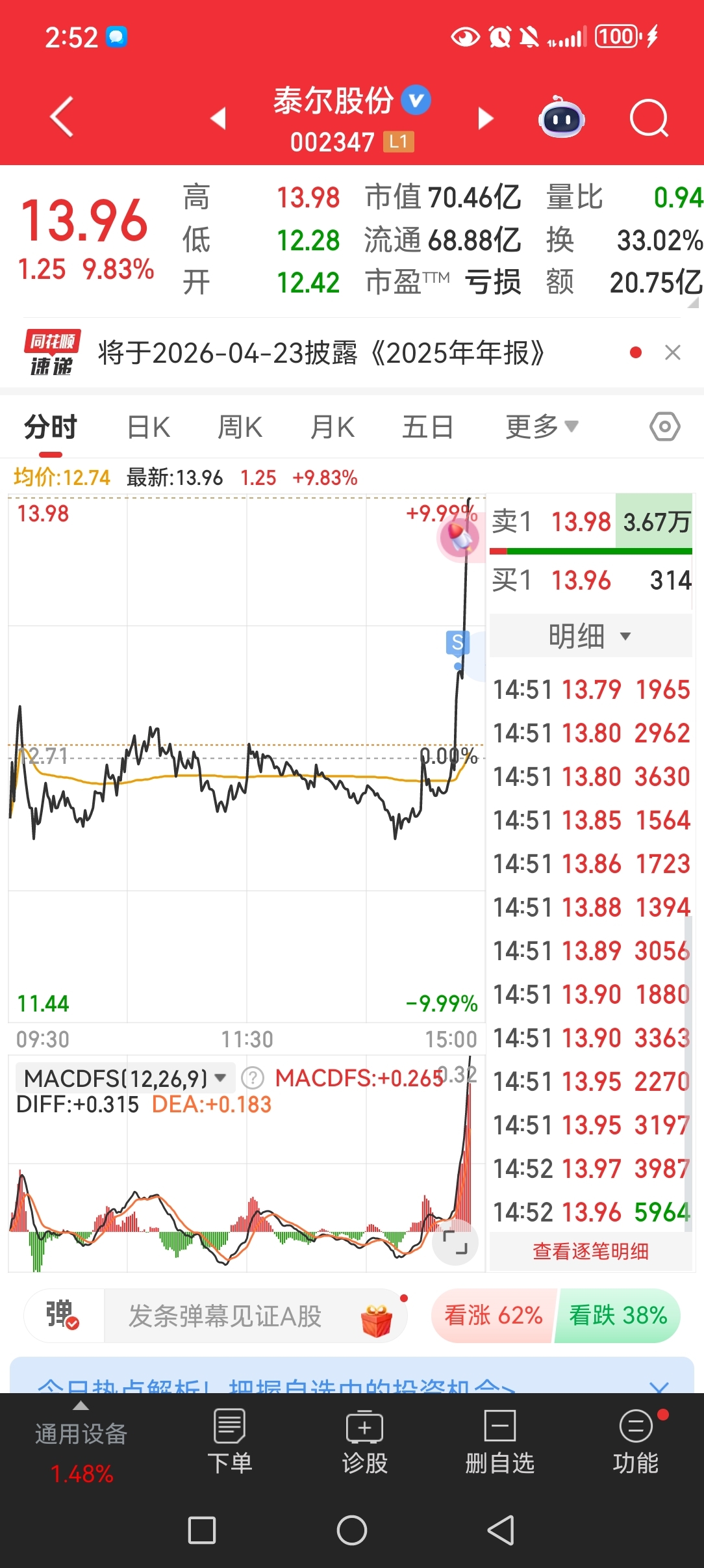 $泰尔股份(SZ002347)$ 昨天唱空的那伙韭菜人呢。一个个说今天跌停板,明明是涨停板。都是不懂装懂。我重仓今天卖飞了也还是赚了。