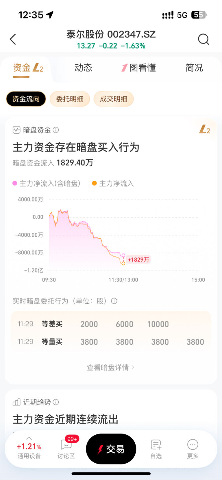 $泰尔股份(SZ002347)$ 目前暗盘流入1829万,