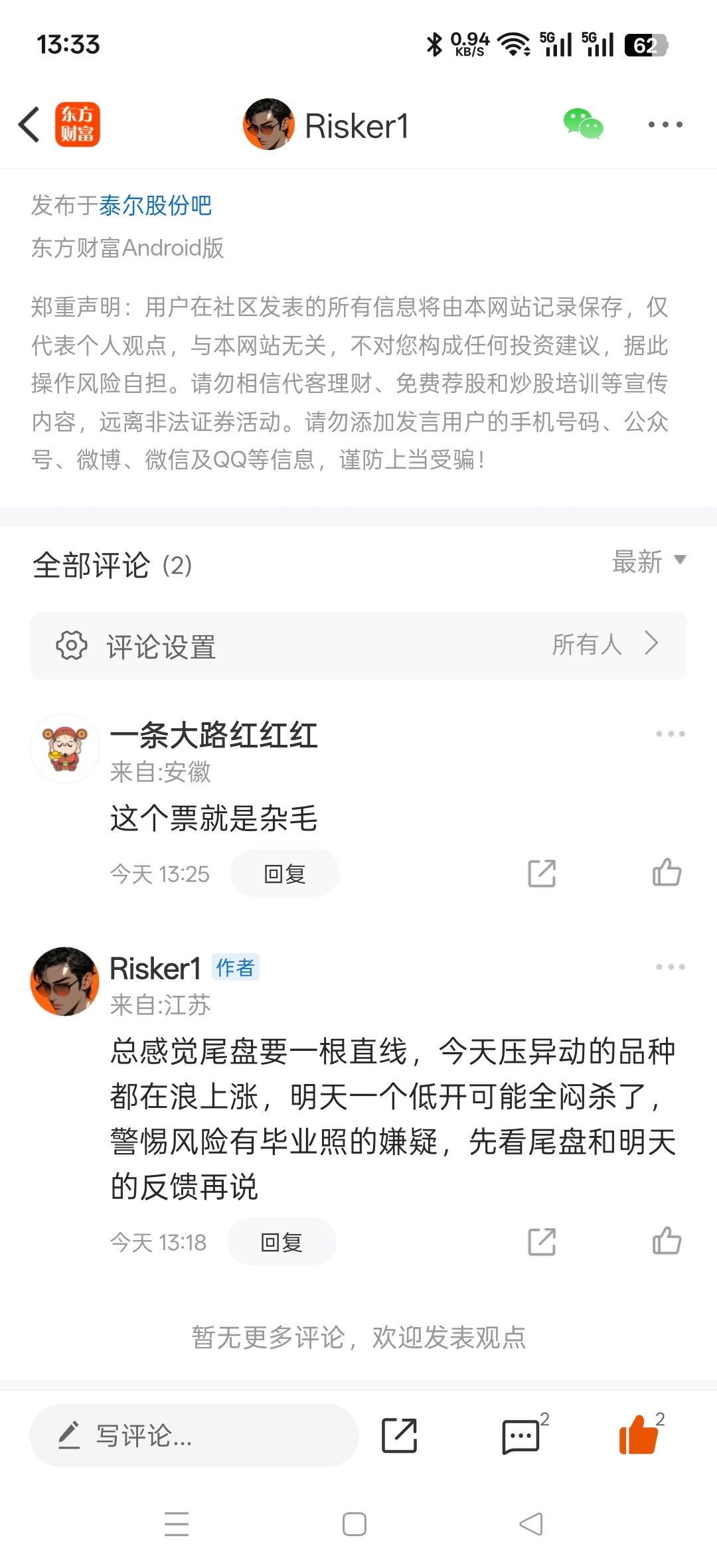 温馨提示: 1.根据《证券法》规定,禁止编造、传播虚假信息或者误导性信息,扰乱证券市场;2.用户在本社区发表的所有资料、言论等仅代表个人观点,与本网站立场无关,不对您构成任何投资建议。用户应基于自己的独立判断,自行决定证券投资并承担相应风险。《东方财富社区管理规定》