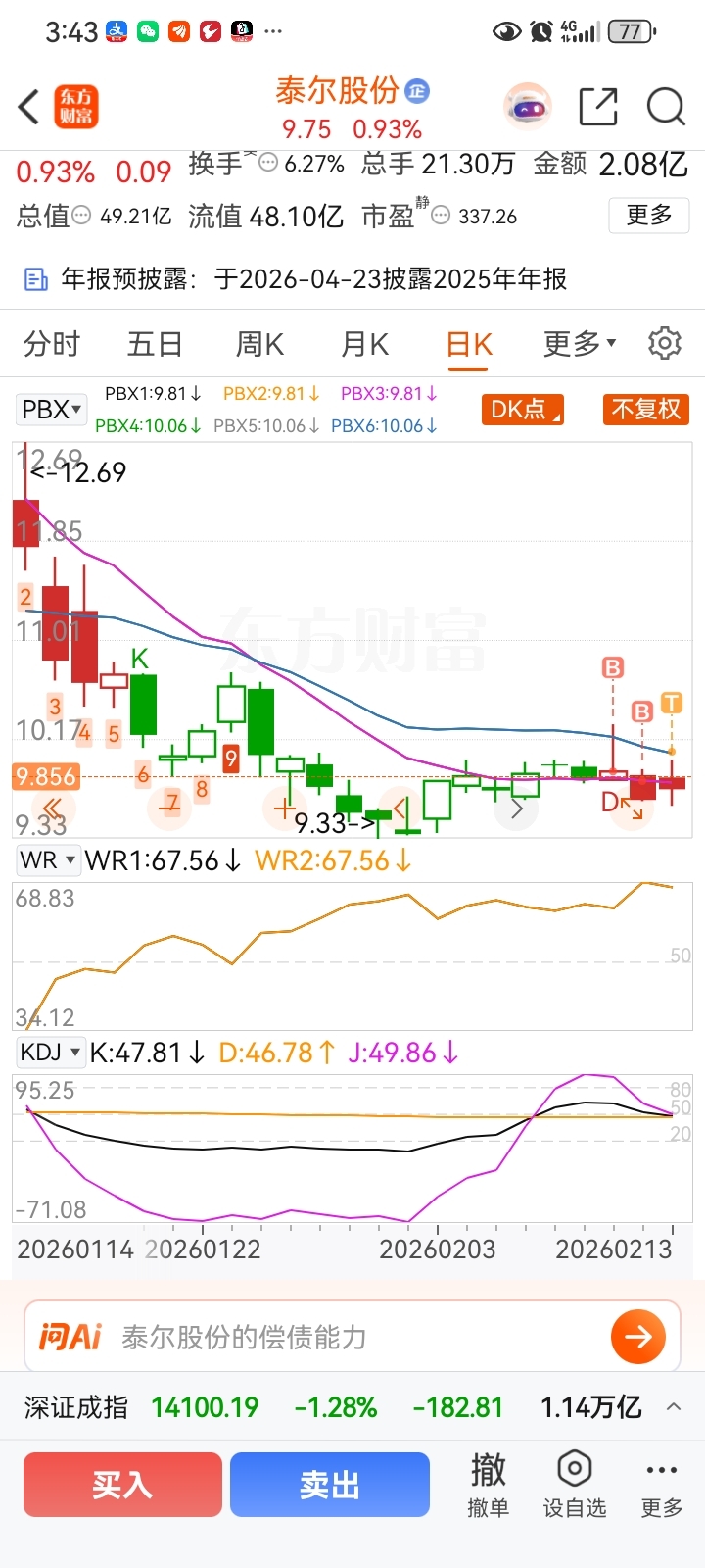 $泰尔股份(SZ002347)$ 我用的指标,紫色线不上穿兰色线,依然小仓位玩玩。日K线横盘,今天做了个T,小仓位多赚三十几元