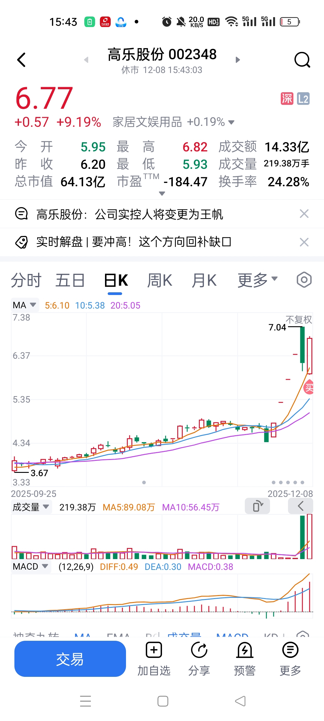 $高乐股份(SZ002348)$ 今天有一起操底的人吗?可能明天溢价不高,