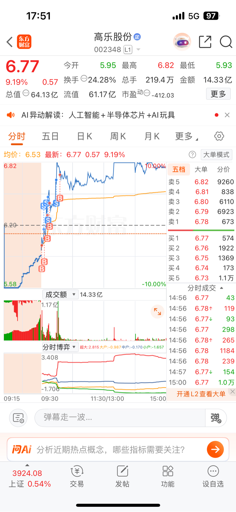 $高乐股份(SZ002348)$ 做了点t,明天继续吃肉