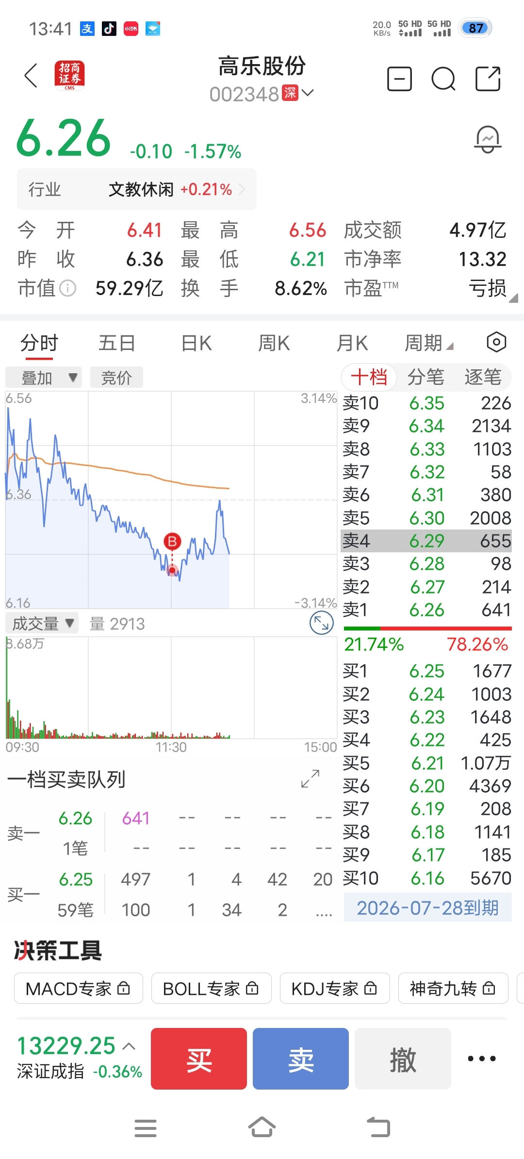$高乐股份(SZ002348)$ 买了100股6.22元没的