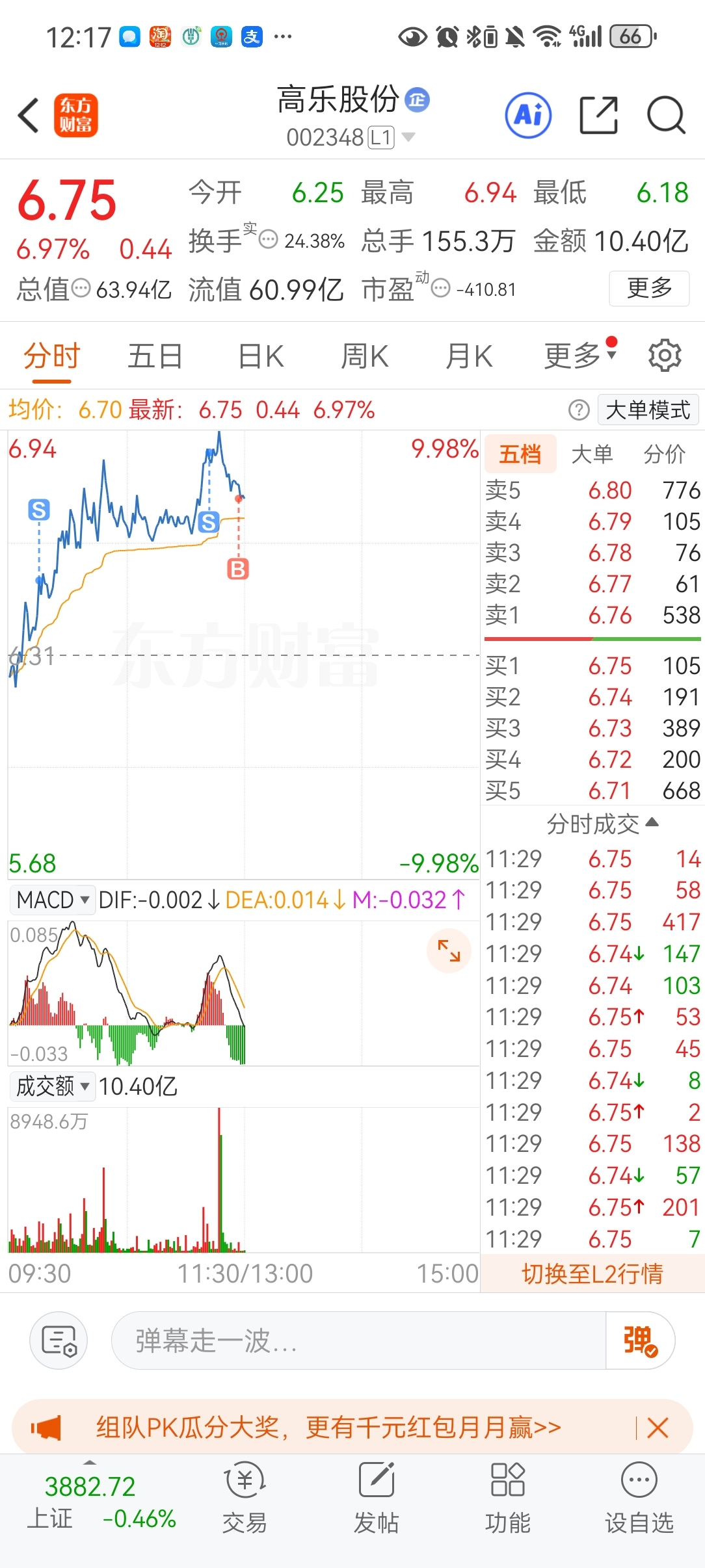 $高乐股份(SZ002348)$ 早上带孩子去医院没时间盯盘,设了3个多点出半仓,出医院一看快涨停了,直接清仓只留了一手,回家路上涨停板设了6.75买了一层仓,没想到居然成交了