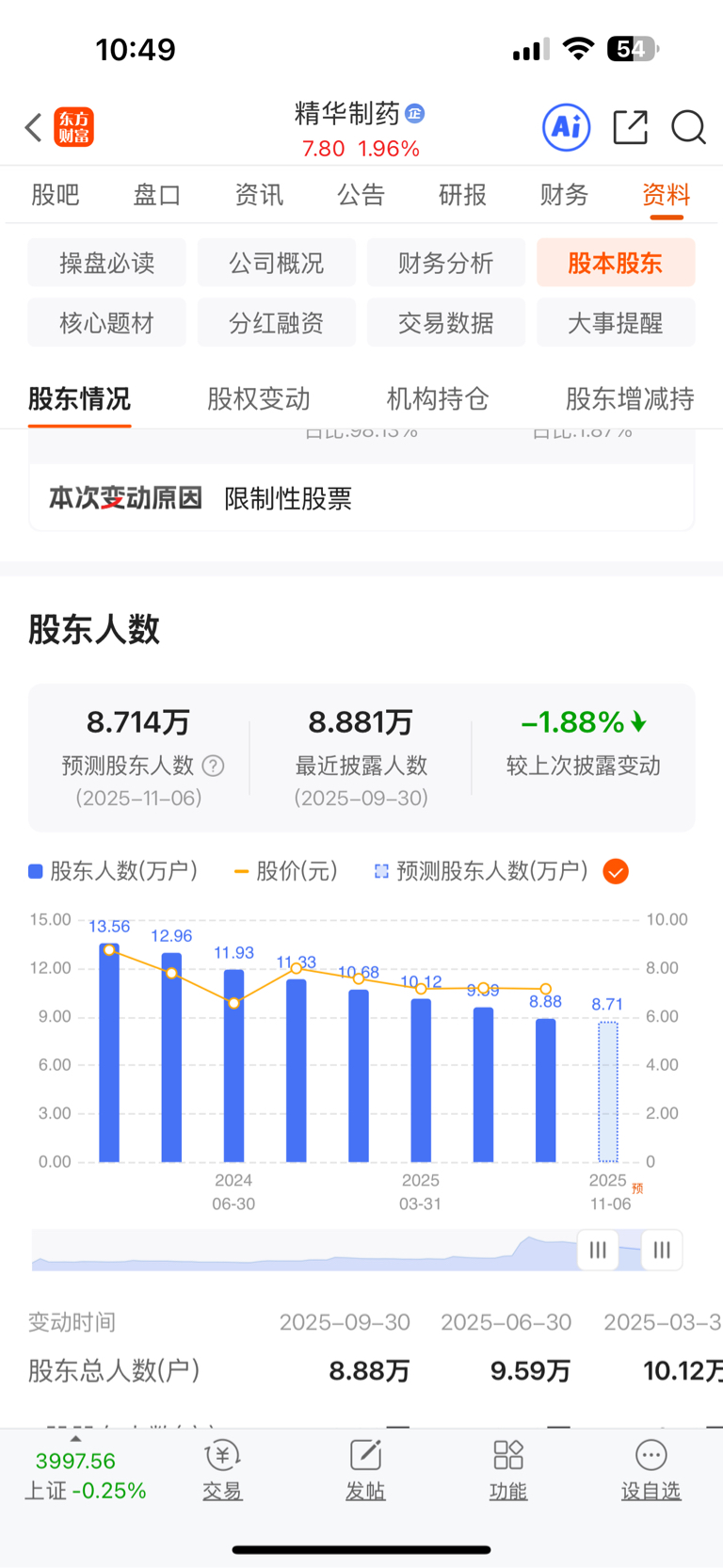 $精华制药(SZ002349)$ 看一下股东人数变化吧,估价一直没有涨多少