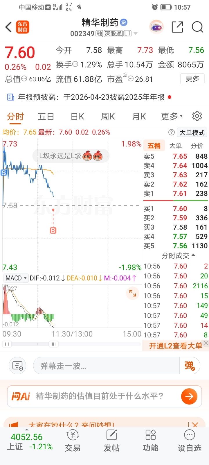$精华制药(SZ002349)$ 10.56分7.57成交了
