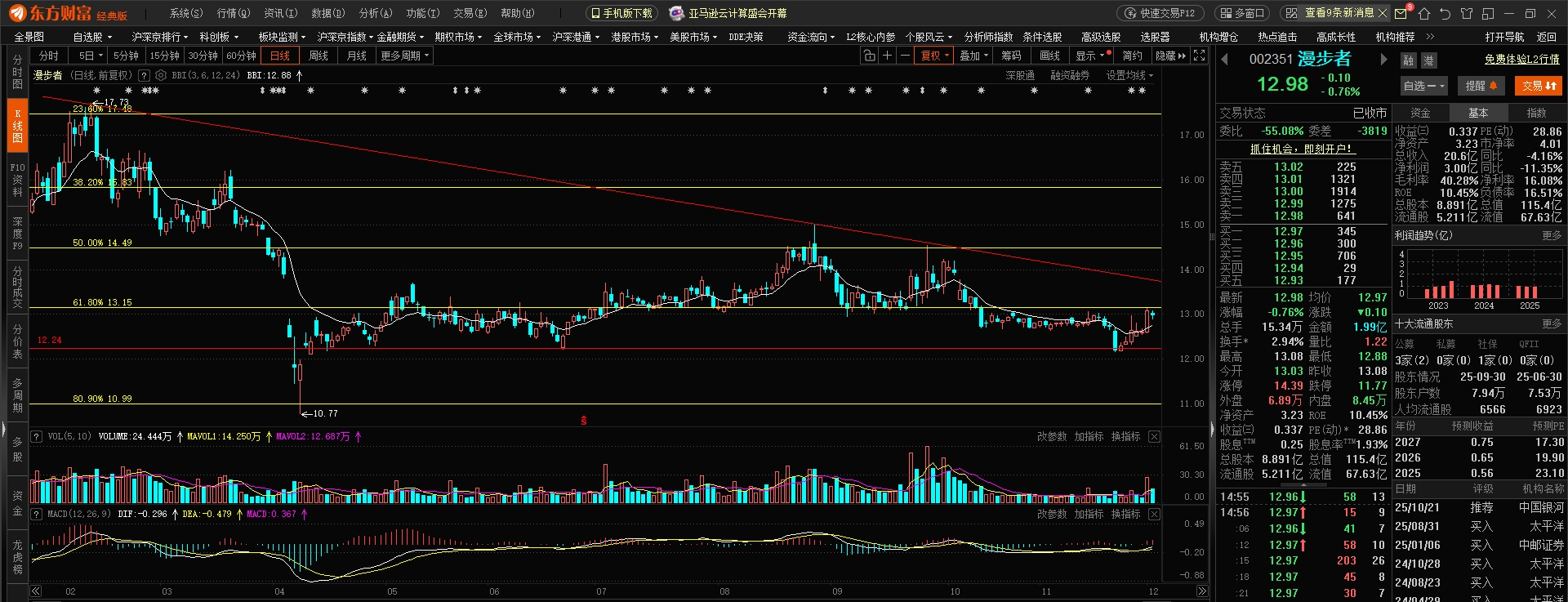 漫步者今天没能冲破13.15这个压力位,在高位缩量震荡,后续大概率要回调12.2