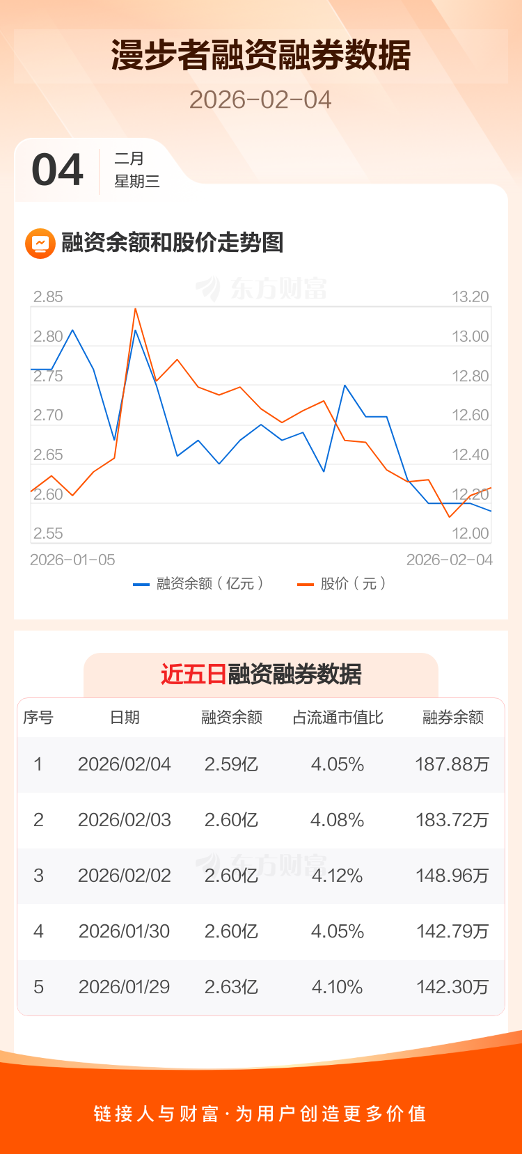 交易所最新数据显示,漫步者于2026年2月4日获融资买入650.99万元,融资偿还759.23万元,当日融资净偿还108.24万元。目前,该股融资余额2.59亿,占流通市值比例为4.05%。