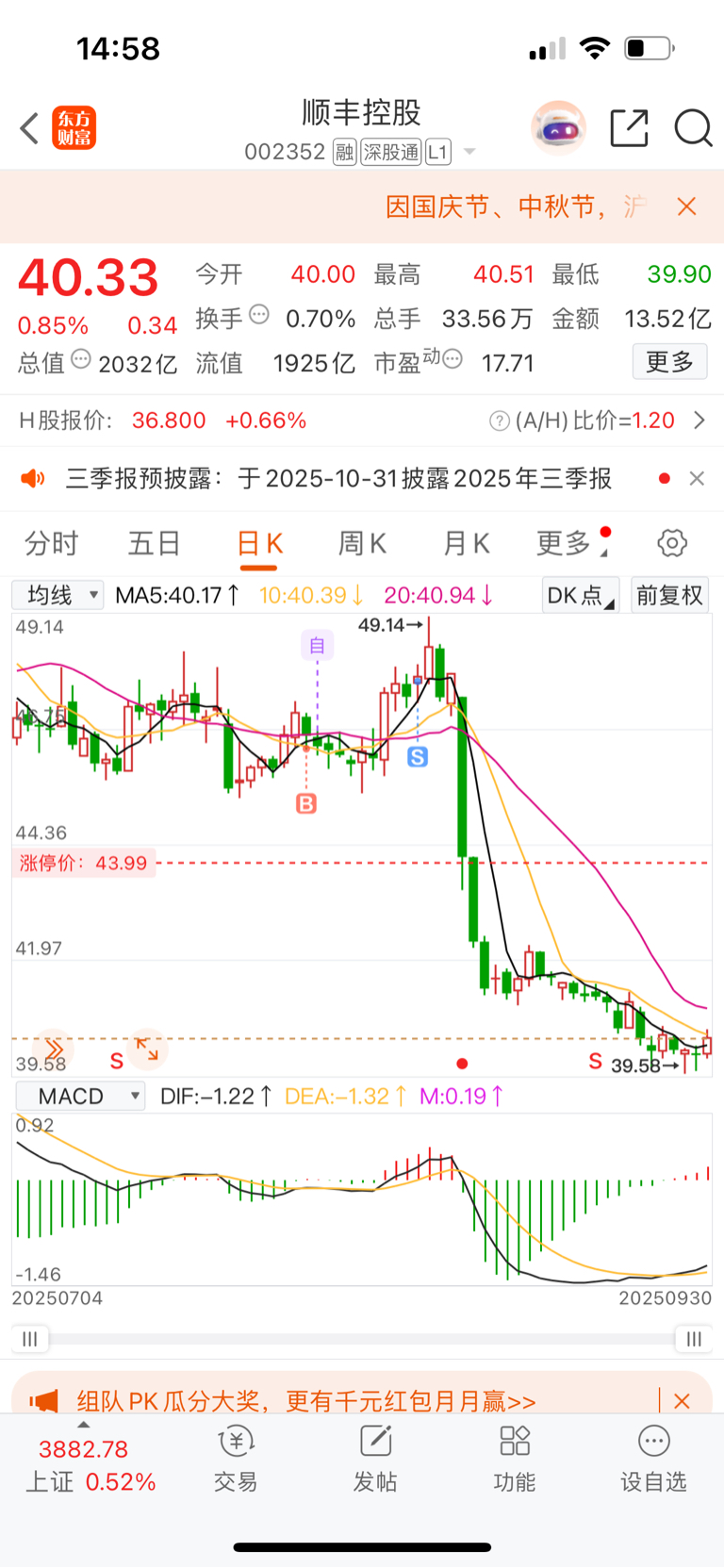$顺丰控股(SZ002352)$ 有没有机会36块接回来