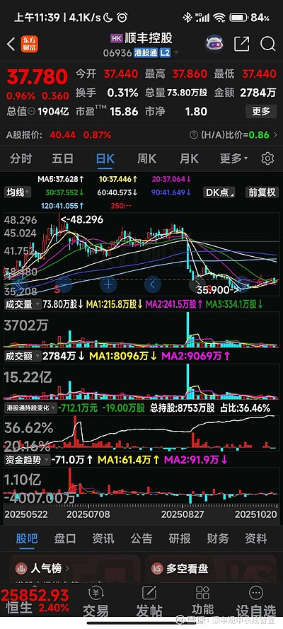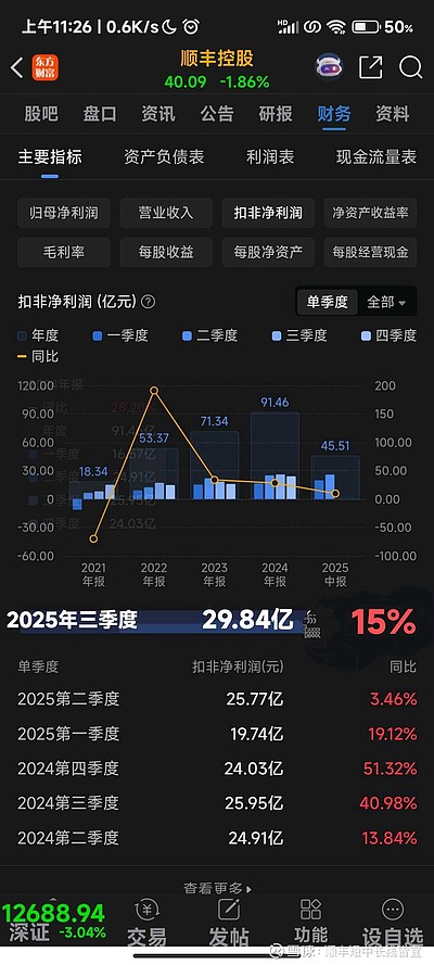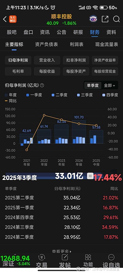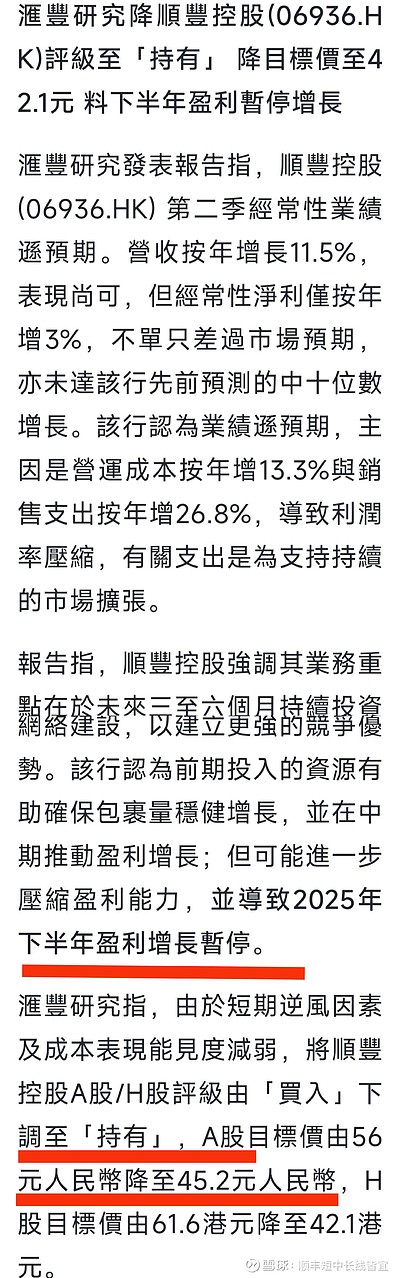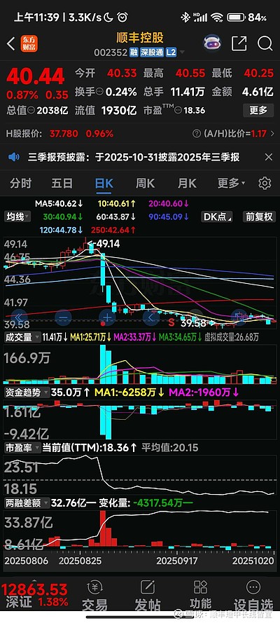 $顺丰控股(SZ002352)$现在的股价是按三季度业绩没有增长情况下给出的股价。看三季报增长情况,股价会给与反映。如果达到我说的业绩增幅股价有望重新拿下50元。如果没有增长,也就是同比增加为零,那股价也就是基本维持目前40元一线徘徊了。大家就自己预判三季报增幅,决定自己操作吧。我个人比较乐观。还有8个交易日交卷,这8个交易日随大盘晃悠了。但最差也不至于负增长。