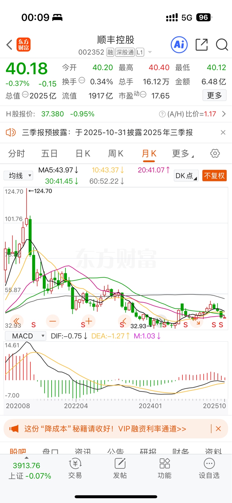 $顺丰控股(SZ002352)$ 踩着30月线,标准的龙回头,成本40.20。安全垫是4.4的股息率,可以翻翻我以前关于平安和招商的帖子,抄底要果断,不然不给你机会。
