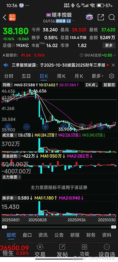 $顺丰控股(SZ002352)$一脚踢k线能否走出来?开关在公司三季报手里?经历了前面的大资金的狂卖后的顺丰近期何去何从?公司三季报是决定因素。北向和基金确实是没少卖,但还有坚守的部分大资金。还有新布局进来的大资金。大资金之间也是博弈和分歧。