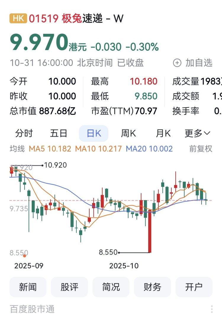 极兔速递报收9.970元港币,10月以来的涨幅为1.9%,今年以来涨幅62.64 %。