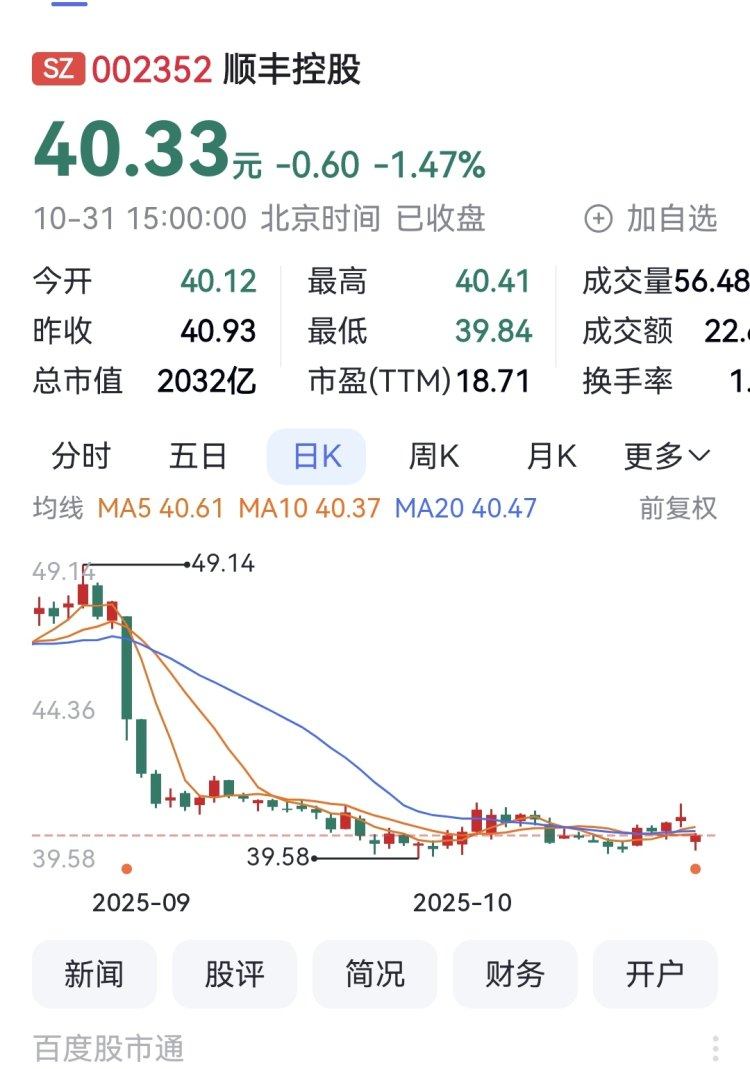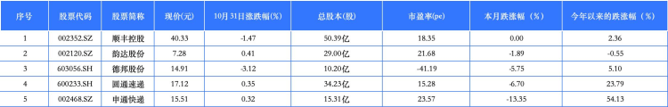 10月31日,顺丰控股报收40.33元,跌1.47%,换手率1.18%,滚动市盈率18.35,本月累计涨幅0.00%,列快递A股第一,今年以来的涨幅为2.36%。