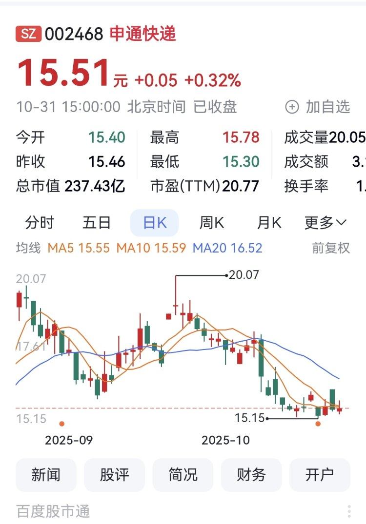 申通快递10月31日报收15.51元,涨0.32%,换手率1.37%,滚动市盈率23.57,总市值15.31亿元,2025年10月涨幅为-13.35%,不过,今年以来的涨幅为54.13%,为快递A股第一。