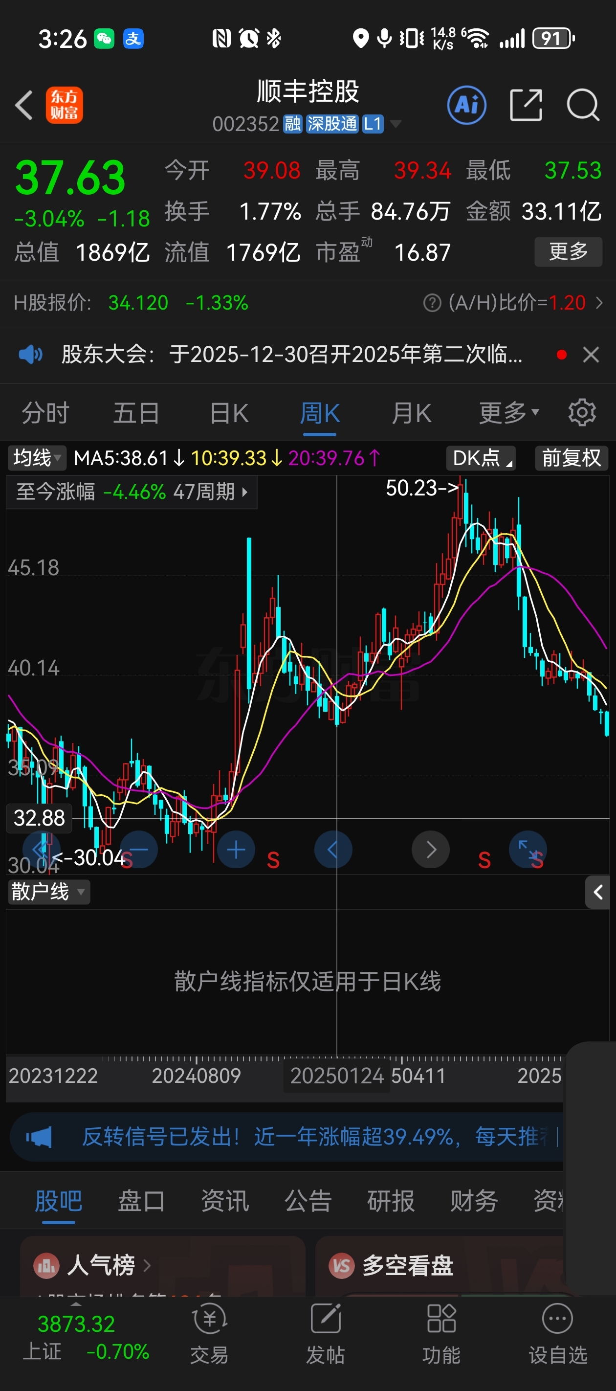 $顺丰控股(SZ002352)$ 阿西吧,又双叒叕破位,短期弱支撑34..强支撑30。。。我看吧,只能等30再入点