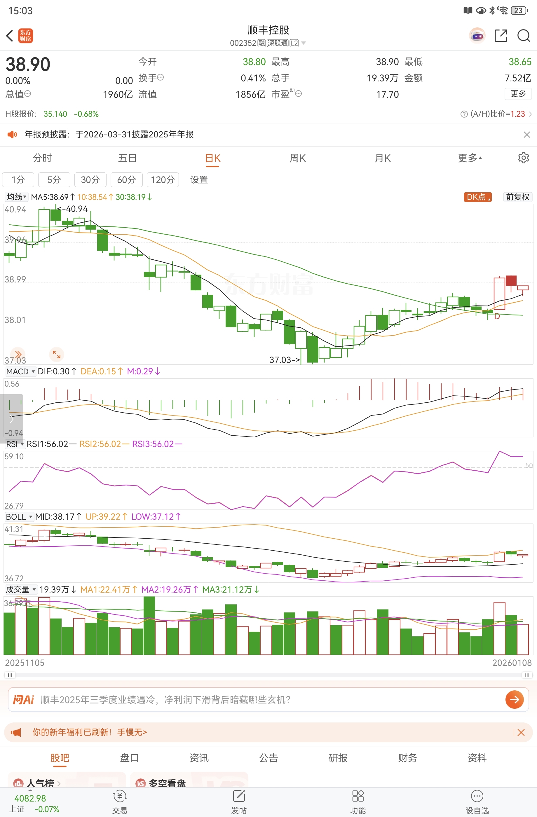 $顺丰控股(SZ002352)$ 明天大概率变盘了没,只要不破1月6日的底线就没问题,就是这种蓝筹股太慢了。