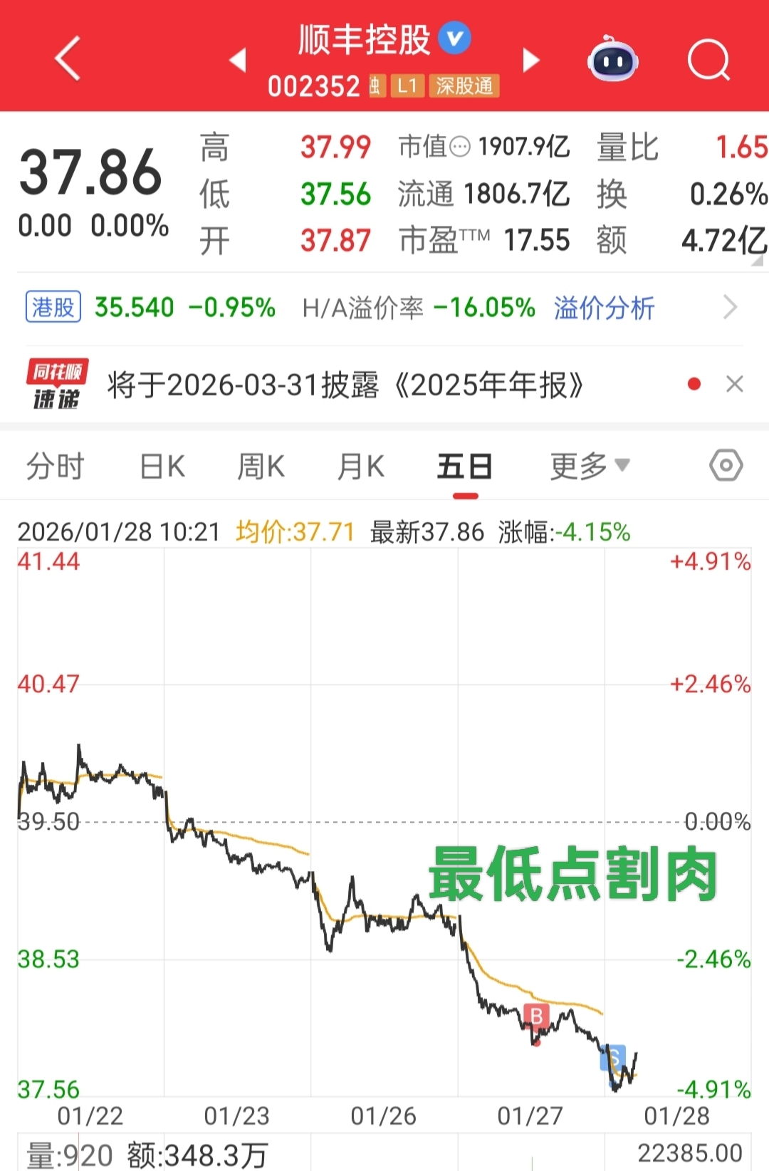 $顺丰控股(SZ002352)$ 割肉离场,几乎割在最低点。韭菜就是我