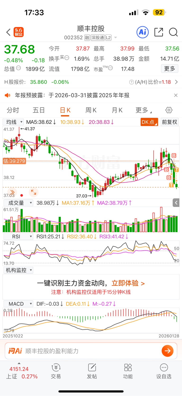 $顺丰控股(SZ002352)$ 你是真出生啊,我刚买进来,你就一路大跌,每天想做T都是最低点收盘,