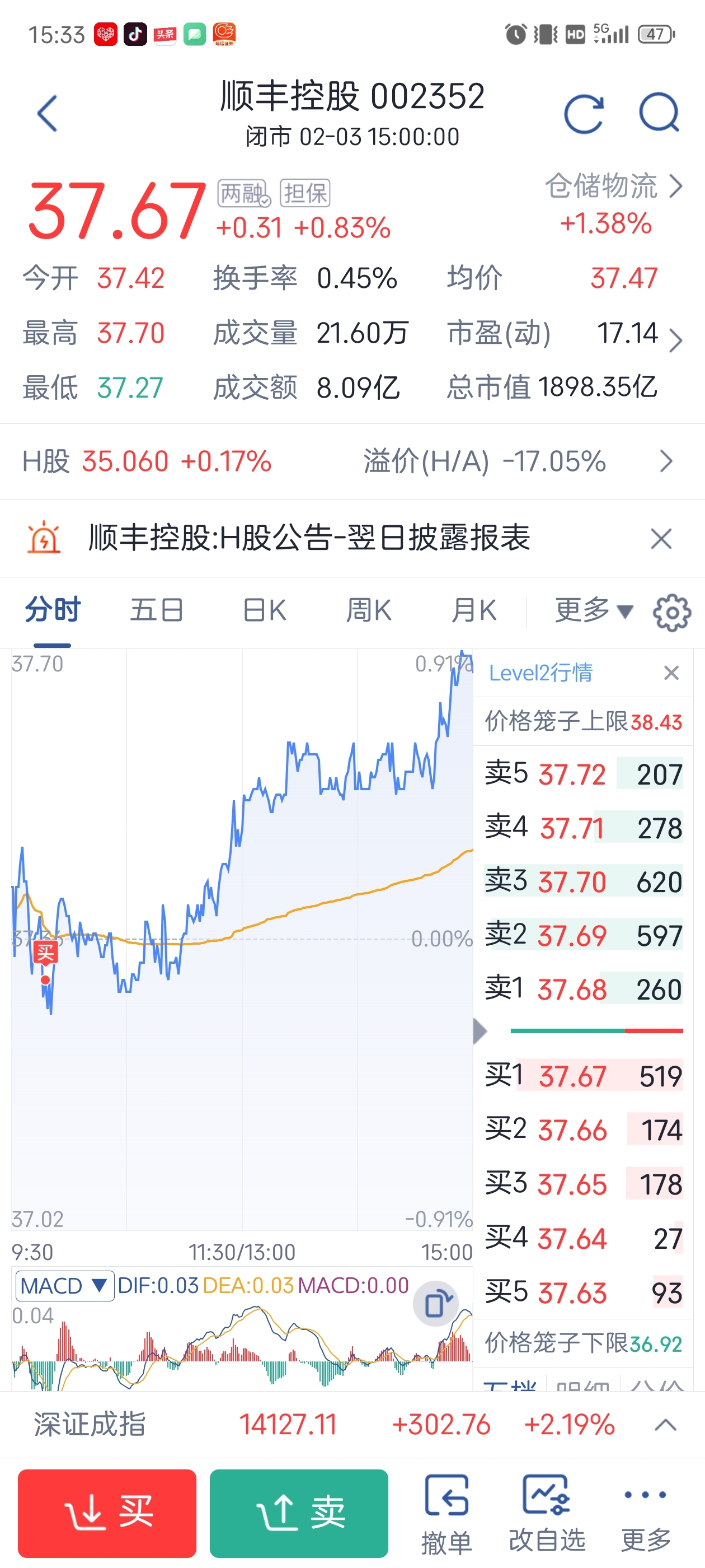 $顺丰控股(SZ002352)$ 今天补了三手,能上39吗
