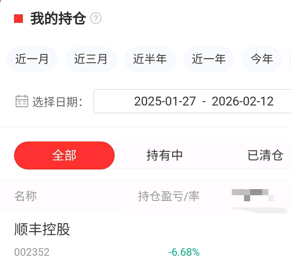 $顺丰控股(SZ002352)$ 2025.1.27——2026.2.12,加今天下跌0.89%,整个农历2025蛇年,持股顺丰亏损7.57%……