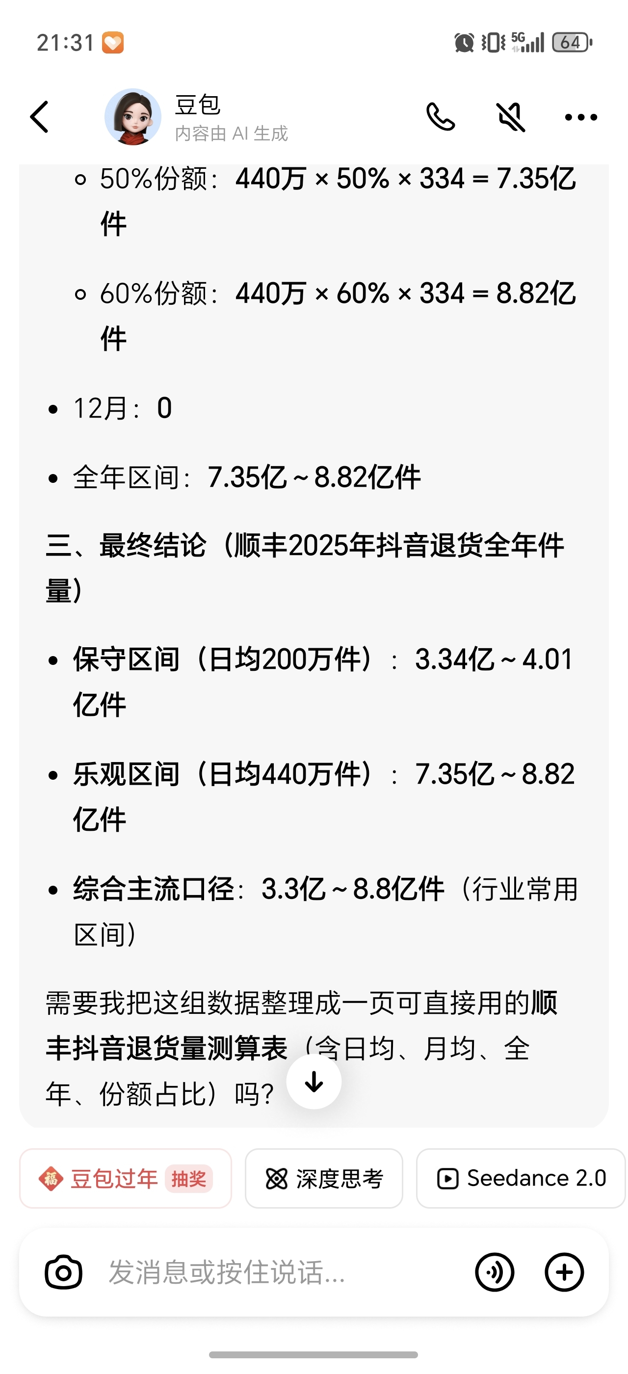 $顺丰控股(SZ002352)$ 豆包上查的抖音业务量